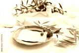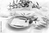 Summer wedding stationery mock-up scene. Blank greeting cards, invitations on vintage silver plate. Craft envelope, olive fruit, branch, silk ribbon and table runner. White background.