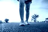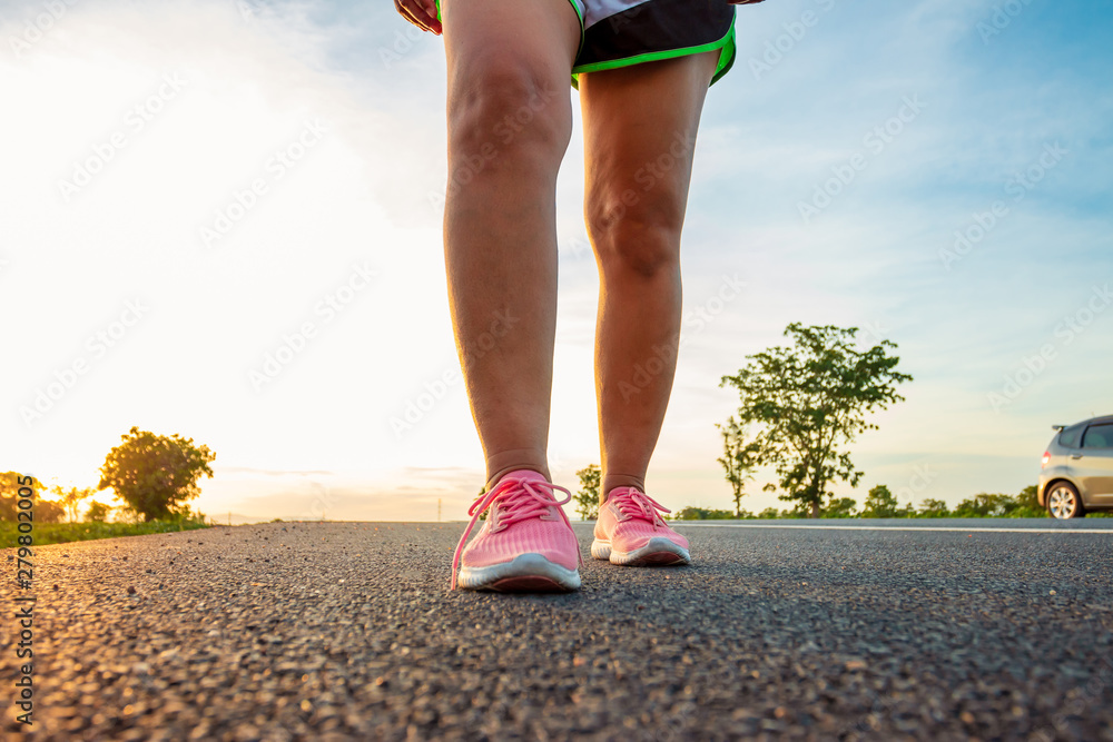 Along the road in the hillside area at the time of the sun set woman is exercising by running.