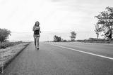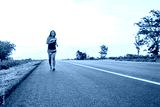 Along the road in the hillside area at the time of the sun set woman is exercising by running.