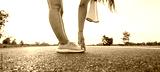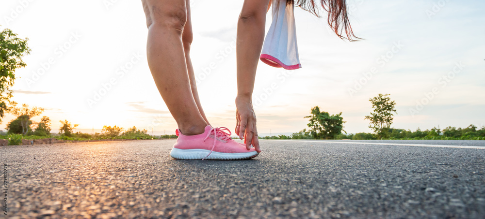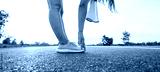 Along the road in the hillside area at the time of the sun set woman is exercising by running.