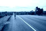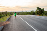Along the road in the hillside area at the time of the sun set woman is exercising by running.
