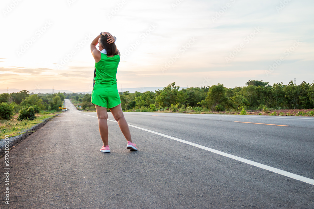 Along the road in the hillside area at the time of the sun set woman is exercising by running.