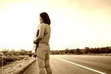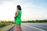 Along the road in the hillside area at the time of the sun set woman is exercising by running.