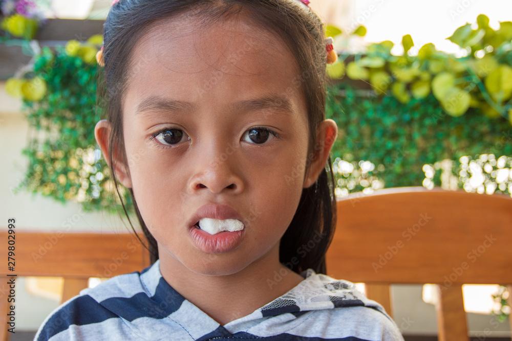 Post-dental girl at dental clinic with gauze at the mouth, Sore and sad emotions