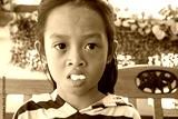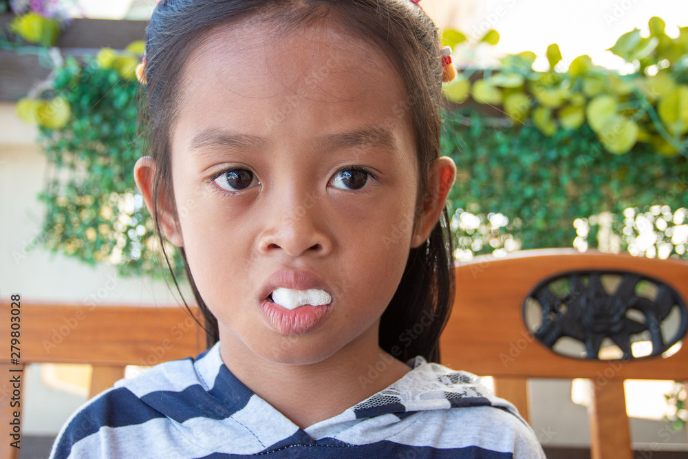 Post-dental girl at dental clinic with gauze at the mouth, Sore and sad emotions