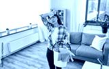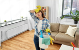 people, housework and housekeeping concept - tired asian woman or housewife holding bucket full of cleaning stuff at home