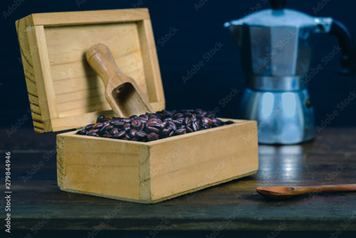 Coffee bean in wood box on old wood background.