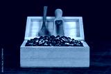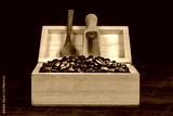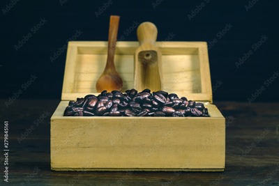 Coffee bean in wood box on old wood background.