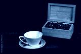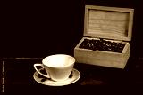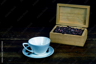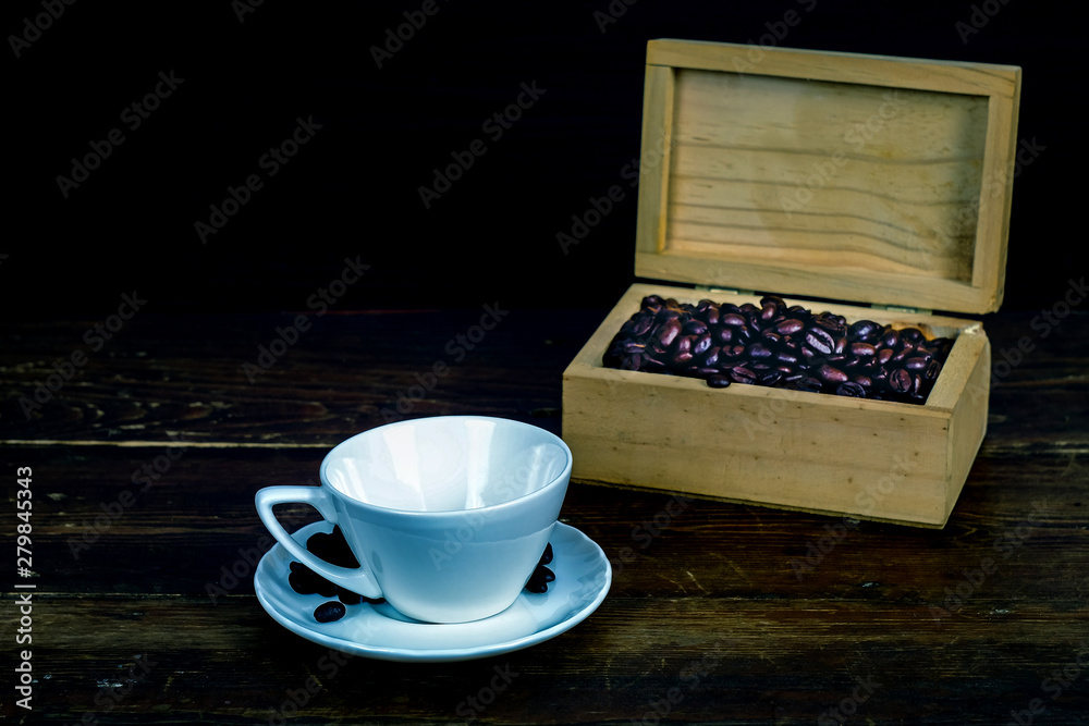 Coffee bean in white coffee cup on old wood background.