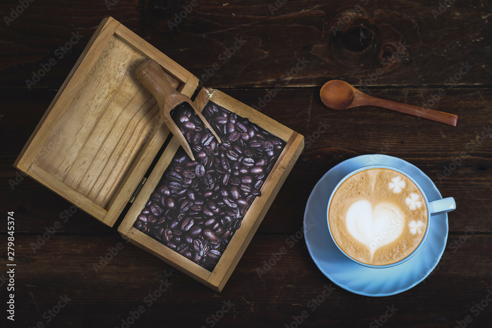 Coffee bean in wood box with late art coffee on old wood background.