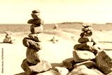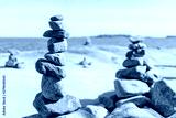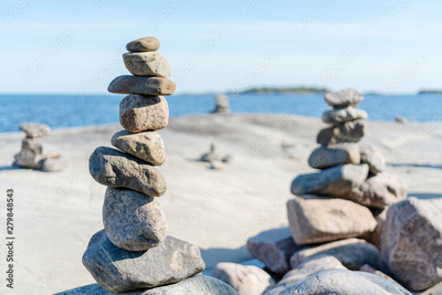 Stacked Rocks balancing, stacking with precision. Stone tower on the shore. Copy space.