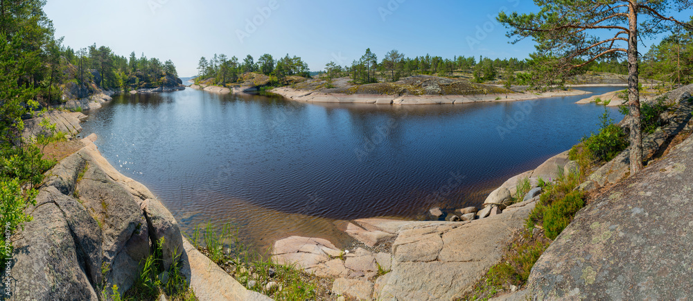 Islands in Lake Ladoga. Beautiful landscape - water, pines and boulders.