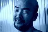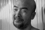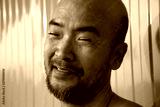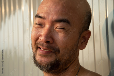 portrait of bald beard Japanese man face in happy funny expression with natural sunlight