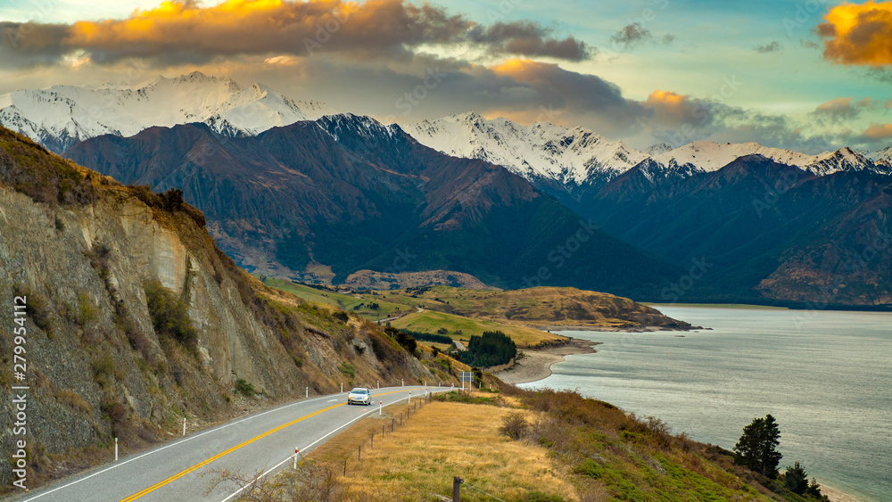 One car ran on a road on the edge of the lake. The background is a great mountain in the evening. Beautiful Clouds at Lake Hawea Lookout in Wanaka Otago, Newzealand
