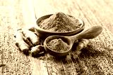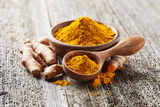 Turmeric root and powder on wooden background