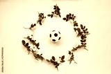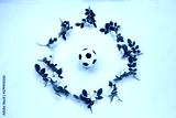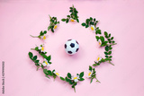 Soccer ball and flowers on pink background.