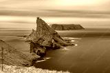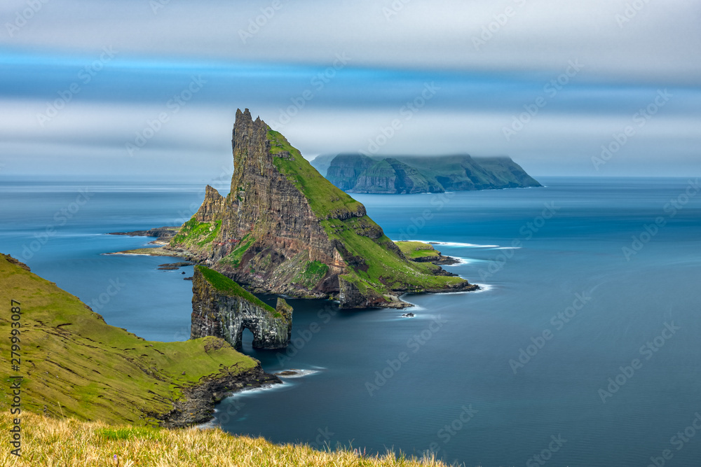Amazing top view long exposure of Drangarnir gate in front of Tindholmur, Faroe Islands