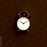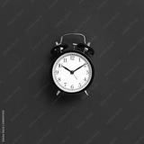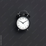 Black retro alarm clock on gray dark background top view Flat lay copy space. Minimalistic background, concept of time, deadline, time to work, morning