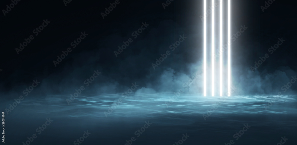 Background of an empty dark-black room. Empty brick walls, lights, smoke, glow, rays