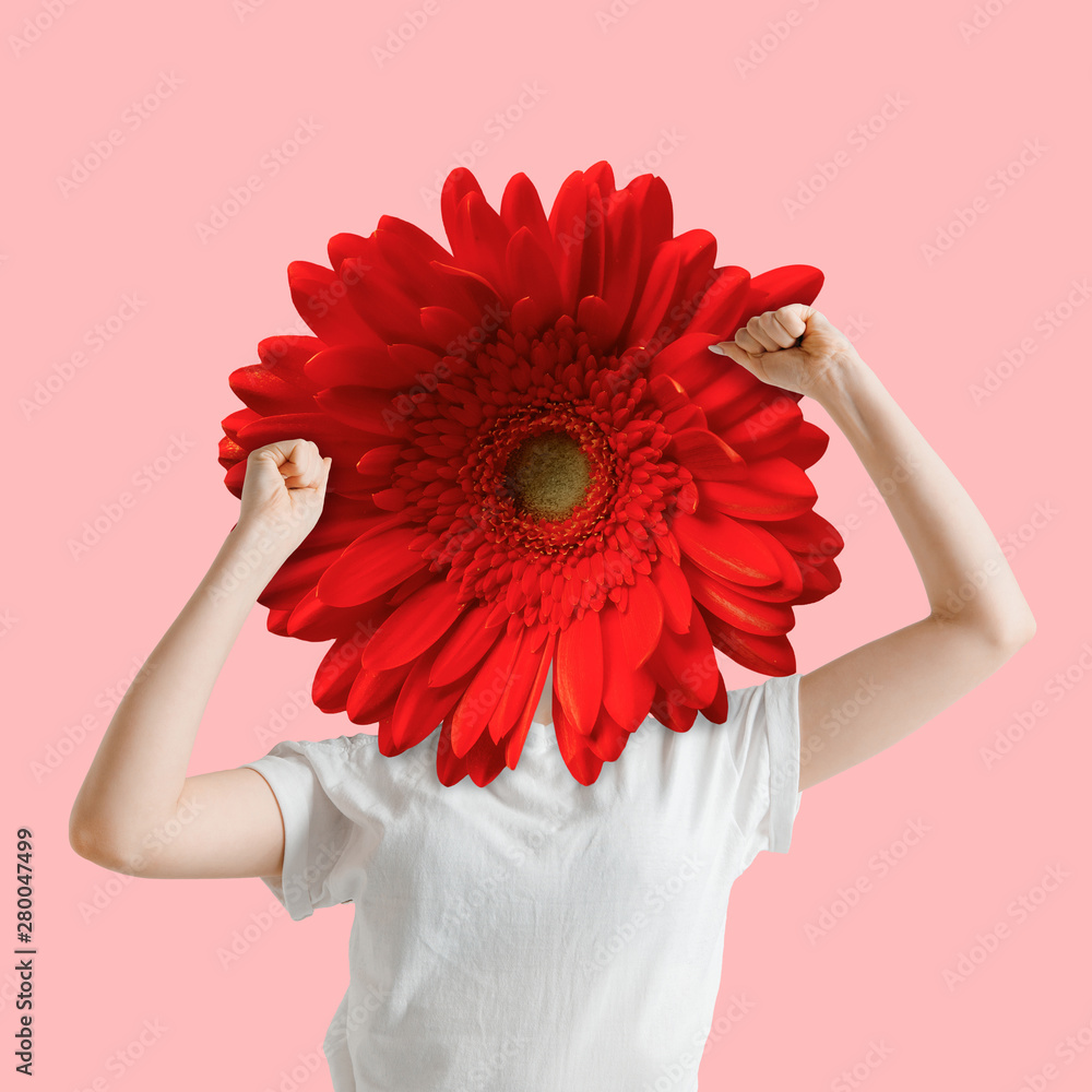 Female body in white shirt headed by bright red flower on coral background. Negative space to insert your text. Modern design. Contemporary art collage. Concept of human emotions and feelings.