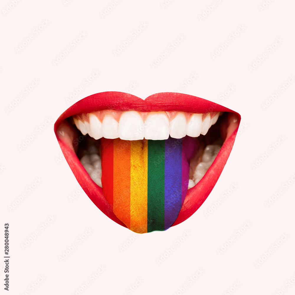 Big female mouth with red lips and tongue as an LGBT flag on pink background. Negative space to insert your text. Modern design. Contemporary art collage. Concept of LGBT people rights, equality