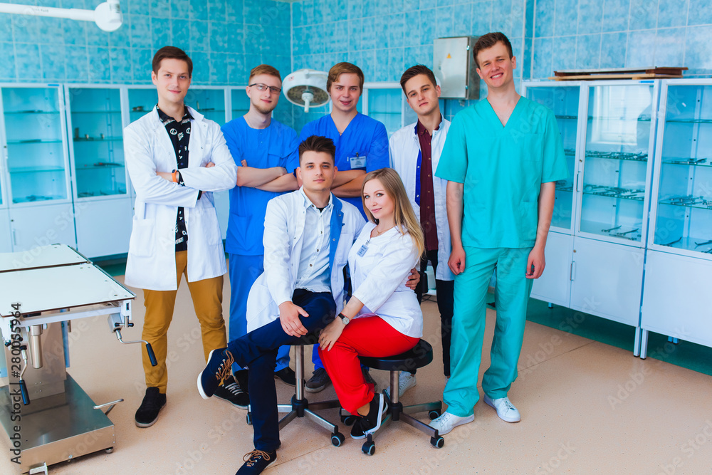 Medical students profession staff. multinational people - doctor, nurse and surgeon. A group of graduates of a medical university in a surgical room.