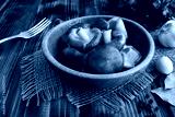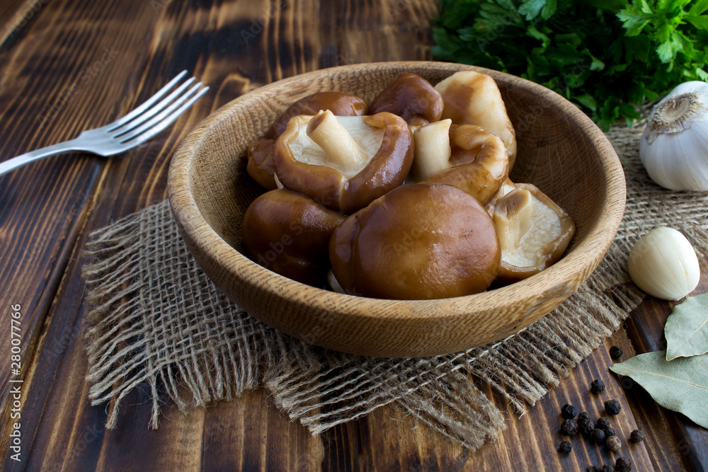 Marinated mushrooms shiitake in the brown plate on the rustic wooden background