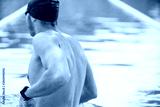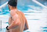 back view of muscular swimmer in swimming cap and goggles standing at swimming pool