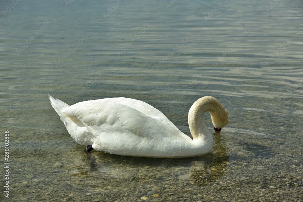 A white beautiful swan basks at a lake