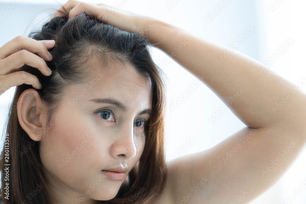 Woman looking reflection in the mirror serious hair loss problem for health care shampoo and beauty product concept