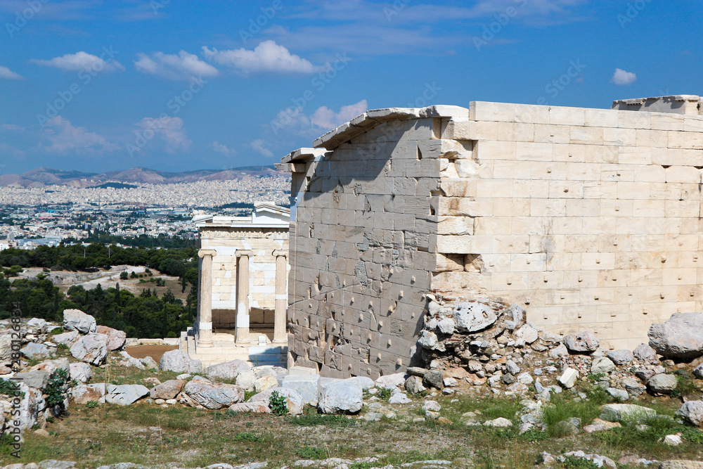 View to Propylaea beautiful monumental gateway to the ancient Acropolis of Athens Greece under bright blue summer sky with view to city Athens on the background