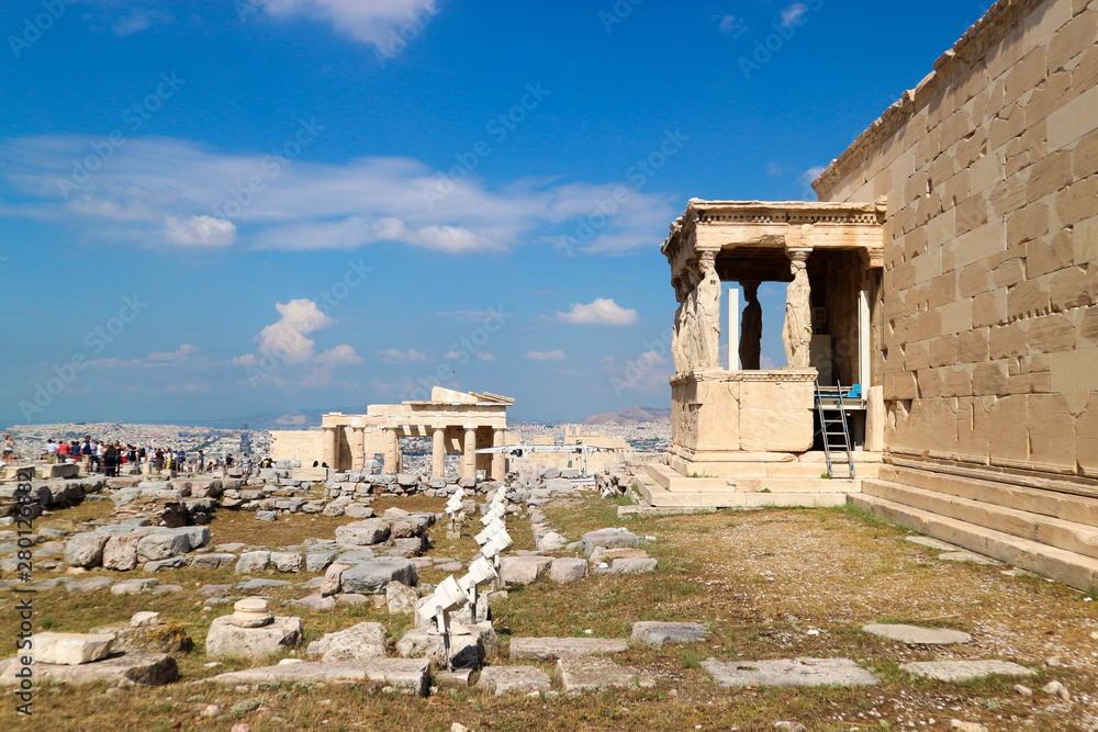 View to top of Acropolis hill with Erechtheion ancient Greek temple in Athens Greece