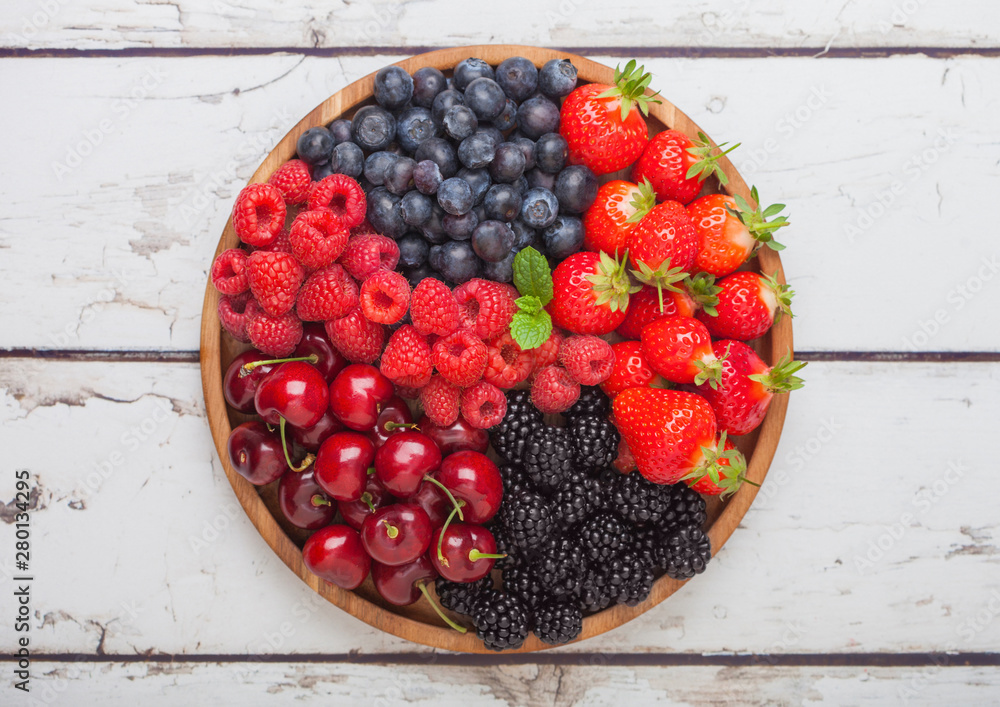 Fresh organic summer berries mix in round wooden tray on white wooden table background. Raspberries, strawberries, blueberries, blackberries and cherries.
