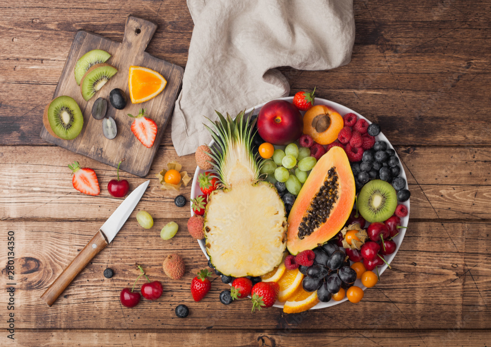 Fresh raw organic summer berries and exotic fruits in white plate on vintage wooden background with chopping board and knife. Pineapple, papaya, grapes, nectarine, orange, apricot, kiwi, pear, cherry.
