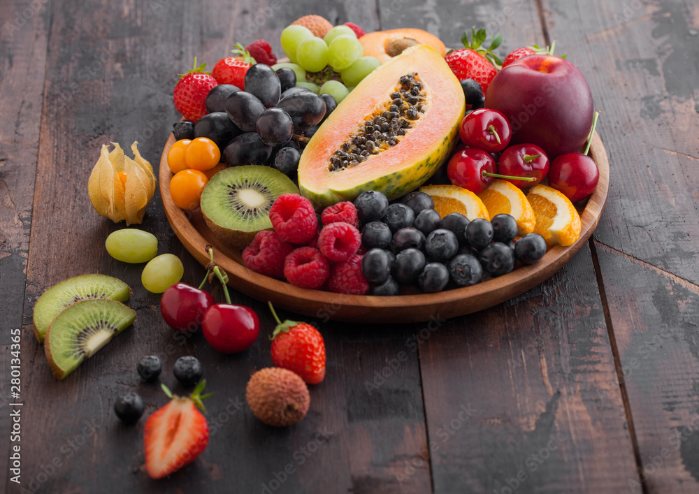 Fresh raw organic summer berries and exotic fruits in round wooden plate on dark wooden kitchen background. Papaya, grapes, nectarine, orange, raspberry, kiwi, strawberry, lychees, cherry.