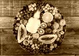 Fresh raw organic summer berries and exotic fruits in round large tray on wooden kitchen background. Papaya, grapes, nectarine, orange, raspberry, kiwi, strawberry, lychees, cherry.