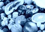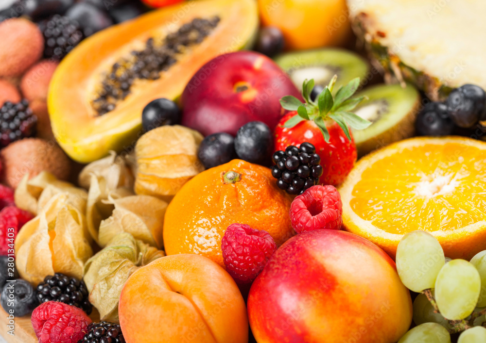 Fresh raw organic summer berries and exotic fruits. Macro. Close up. Pineapple, papaya, grapes, nectarine, orange, apricot, kiwi, lychees, cherry and physalis, raspberry.