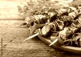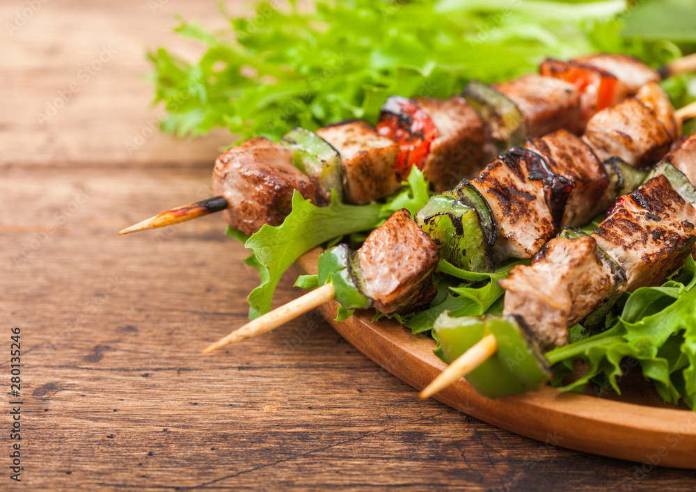 Grilled pork and chicken kebab with paprika in round wooden plate of lettuce salad on wooden background.