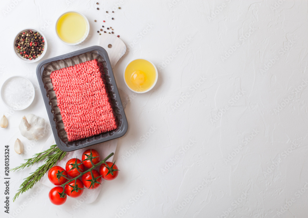 Tray with raw minced homemade beef meat with spices and herbs. Top view and space for text. On top of white kitchen table background. With pepper salt and tomatoes.