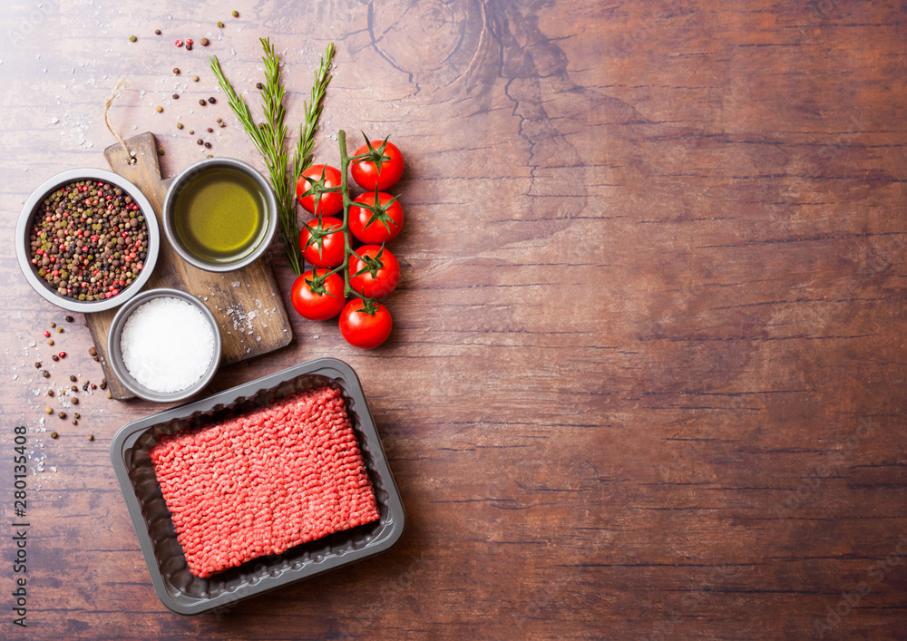Tray with raw minced homemade beef meat with spices and herbs. Top view and space for text. On top of wooden kitchen table background. With pepper salt and tomatoes.