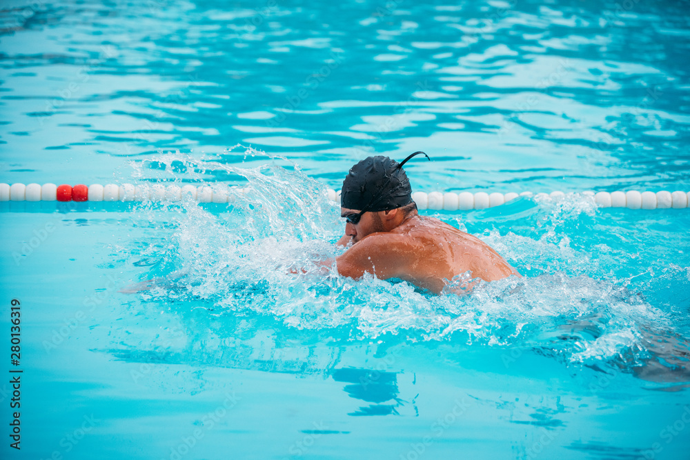 Closeup male athlete swimming breaststroke in pool during Champions.