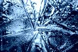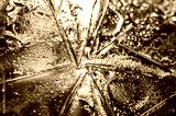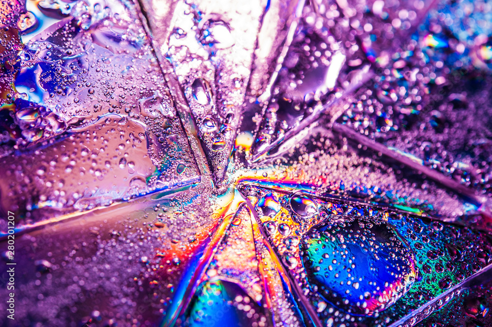 Background in the style of the 80-90s. Real texture of broken glass or ice and drops in bright acid colors.
