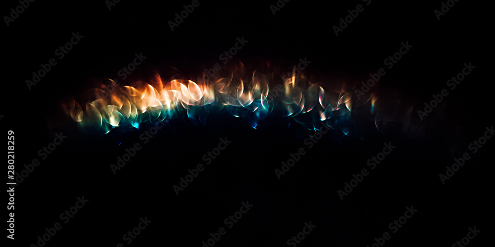 Iridescent holographic rainbow background. Colorful lens flare bokeh texture on black