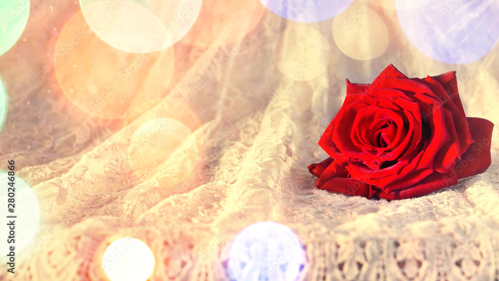 Red rose in the morning sun on a rustic-style lace dress. Valentine's day background