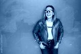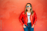 Attractive woman looking at camera and laughing with sunglasses and red leather jacket over red background. Rocker Girl in urban background.