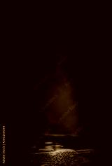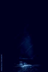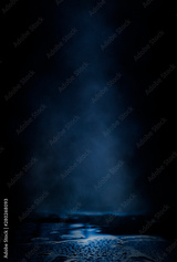 Empty street scene background with abstract spotlights light. Night view of street light reflected on water. Rays through the fog. Smoke, fog, wet asphalt with reflection of lights.
