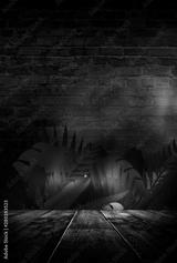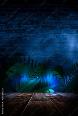 Night concept of a wooden table scene. Tropical leaves neon light. Blank poster, scene night view.