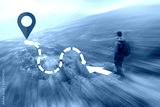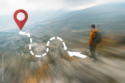 Traveler man walking to route with location GPS pin. Image with motion blur effect.
