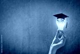 Innovative learning, creative educational study concept for graduation and school student success with world lightbulb on teacher chalkboard