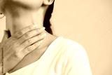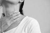 Sore Throat. Closeup Of Beautiful Young Woman Hand Touching Her Ill Neck. Healthcare and medical concept.